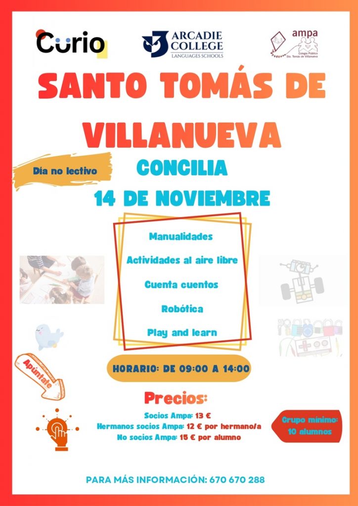 Al ser el 14 de noviembre no lectivo y con el fin de conciliar la vida familiar y laboral, el AMPA pone a vuestra disposición a la empresa que imparte las actividades extraescolares habitualmente. Contactar con ella en el teléfono 670 670 288.