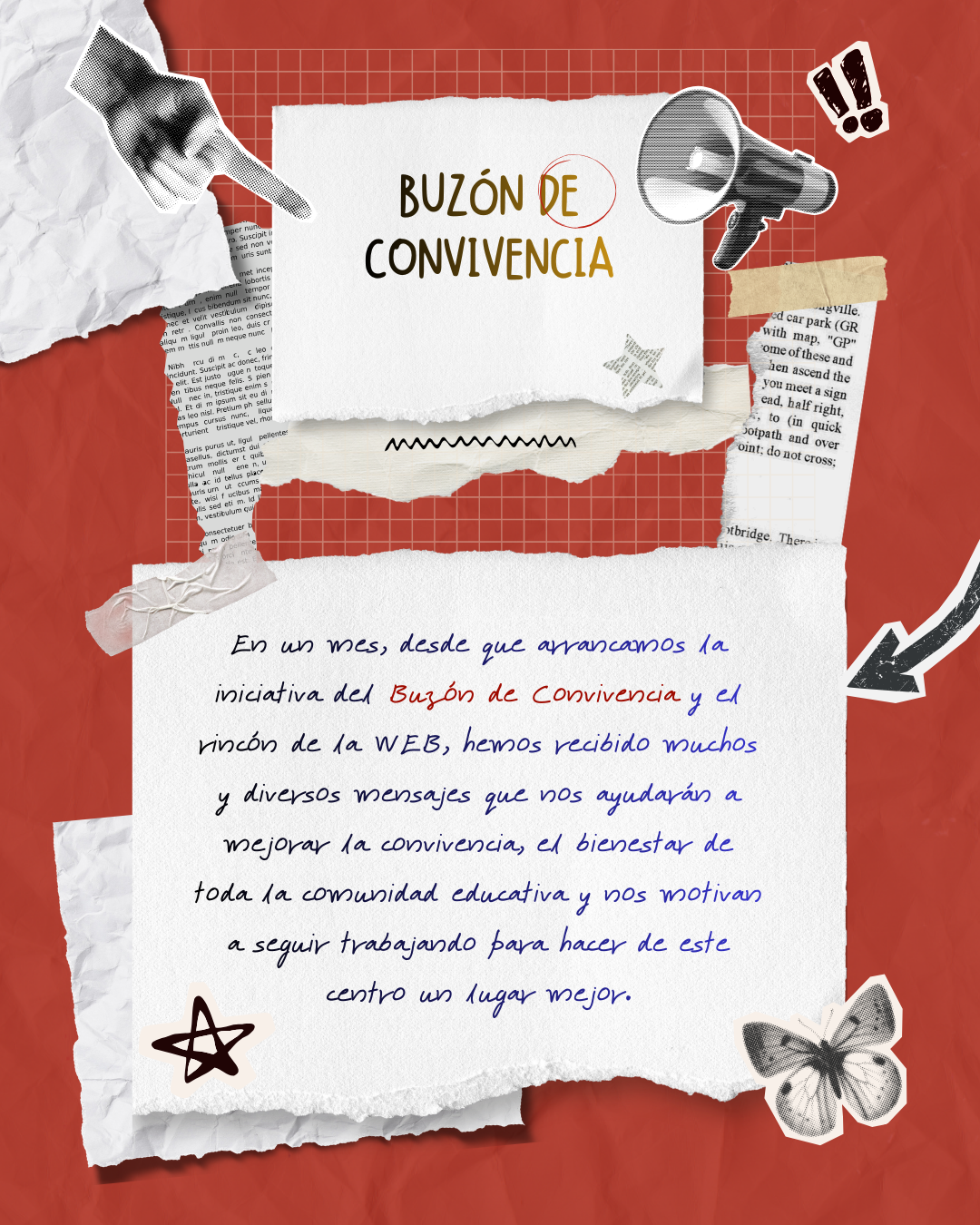 En un mes, desde que arrancamos la iniciativa del Buzón de Convivencia y el rincón de la WEB, hemos recibido muchos y diversos mensajes que nos ayudarán a mejorar la convivencia, el bienestar de toda la comunidad educativa y nos motivan a seguir trabajando para hacer de este centro un lugar mejor.